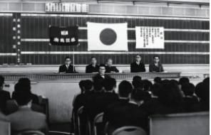 1945(昭和20)年8月15日、終戦を迎えた廣島証券商事は、直ちに会社再建に取り掛かった。だが、社屋は全焼し、資金もゼロに近かった。11月に入り、創業者の自宅跡地にバラックの自宅兼事務所が建てられた。営業再開を目指し、事業資金を集め、翌1946年、営業再開を果たす。5月には、銀山町の焼け跡に社屋を再建し、軍隊から復員してくる社員も少しずつ増えて、社内に活気が戻ってくる。1947年7月には商号を「廣島証券株式会社」に変更し、新社屋を建設し移転。新しい時代にふさわしい事業体制が整った。